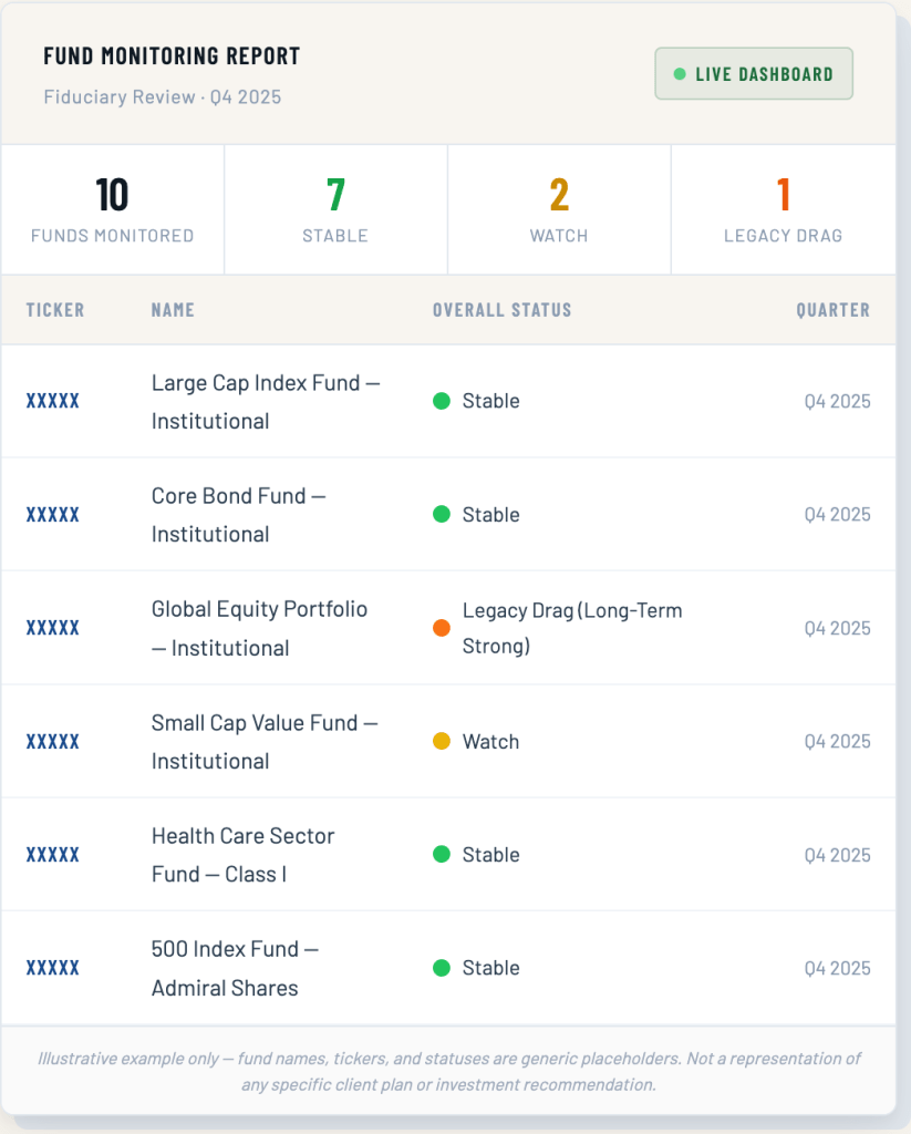 401(k) Workbench centralizes fund monitoring, decision tracking, and documentation in a single structured system.
